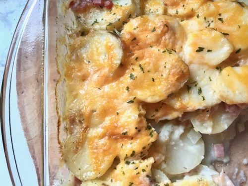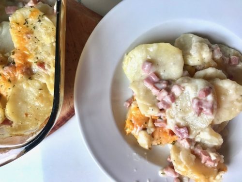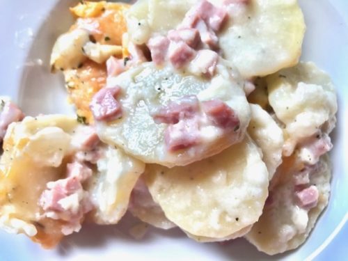 - Place 1/3 of the potatoes topped with 1/3 of ham and 1/3 of the sauce. Repeat layers ending with sauce on top.
