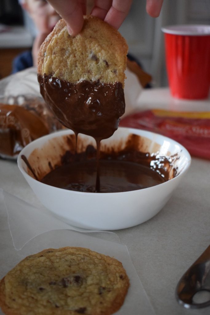 They started with a delicious chocolate chip cookie recipe (which would’ve been delicious enough), but then once the cookies had cooled a bit, they dipped them in Shelby’s magic shell recipe