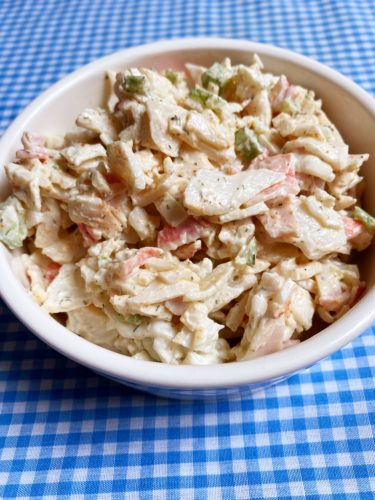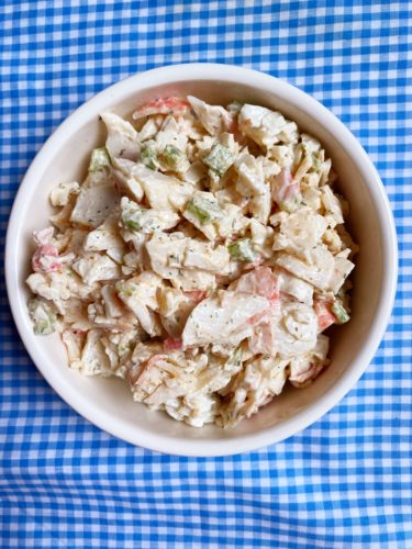This classic seafood salad was a favorite of mine from growing up. I’m sure it comes as no surprise (due to my love of mayo) that when eating out at a sandwich shops a seafood salad sandwich would be my top choice. A refreshing seafood with crunchy celery and creamy, flavorful dressing. This recipe is easy to make, especially if you start with the vacuumed sealed imitation crab, next you mix in a few ingredients and spice and voila! you have a tasty spread. I like to serve it on a croissant, quality hoagie or even as a cracker spread. If I’m feeling super healthy, I take some romaine leaves and serve it as a lettuce wrap.