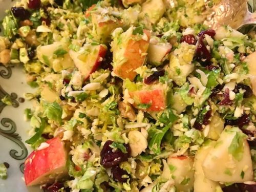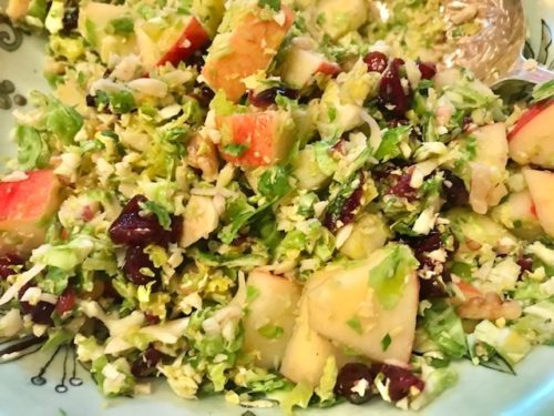 - Place the shredded sprouts in large bowl. Add the chopped apple, cranberries, nut, and Parmesan cheese. Drizzle the salad with the dressing and toss well. Season with salt and pepper and serve.