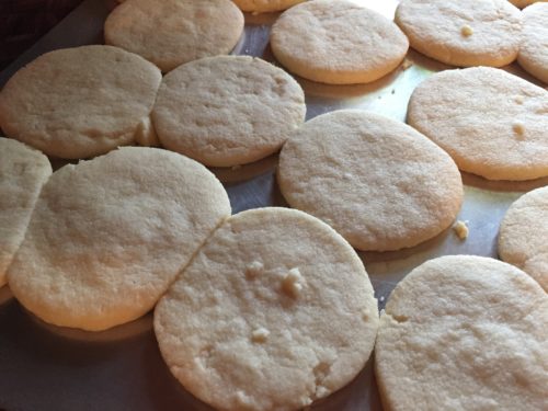 - Roll onto lightly floured surface and cut into rounds. Place on cookie sheet and bake approx 20 min or you see a bit of brownness on the edge--just a bit. 🙂