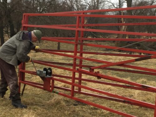 Above is a portion of our portable corral. He sets it up in a pasture to catch cattle to move or work on. In this case, he was setting up for the twins’ mama. I should have taken more photos. She circled around a few times, then she walked right into it. Good mama! We moved her, then to where her babies were getting some attention.