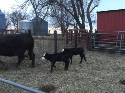 Those little cuties got off to a rough start. Mr. Farmer found them in a mud puddle shivering away. He took them to another farm where we have a calf warmer. It’s kind of like placing them in an incubator for a couple hours to warm up. Absolutely wonderful invention. It reminds me a little of a gas grill–you open up the lid, place them on the grate, and there’s a heating element under the grate with a little fan that sends the heat up to them. You close the lid and set the timer for a couple hours. Open the lid and they are ready to see their mama and find something to eat.