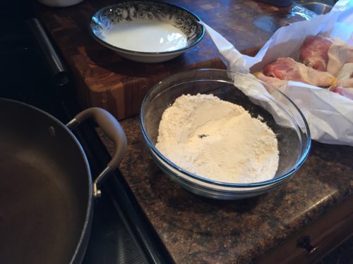 I pulled out the largest skillet and set the temp on the stovetop to medium hi. Next I grabbed two mixing bowls. One for flour and one for buttermilk.