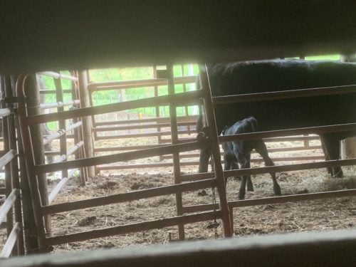 One young mama likes to kick her calf away. She’s in a pen in the barn, so Mr. Farmer oversees the little calf entering the pen for his meals. He’s a vigorous eater and loves life. He’ll make it just fine. This little calf has learned to come to dinner from behind so he doesn’t get kicked.