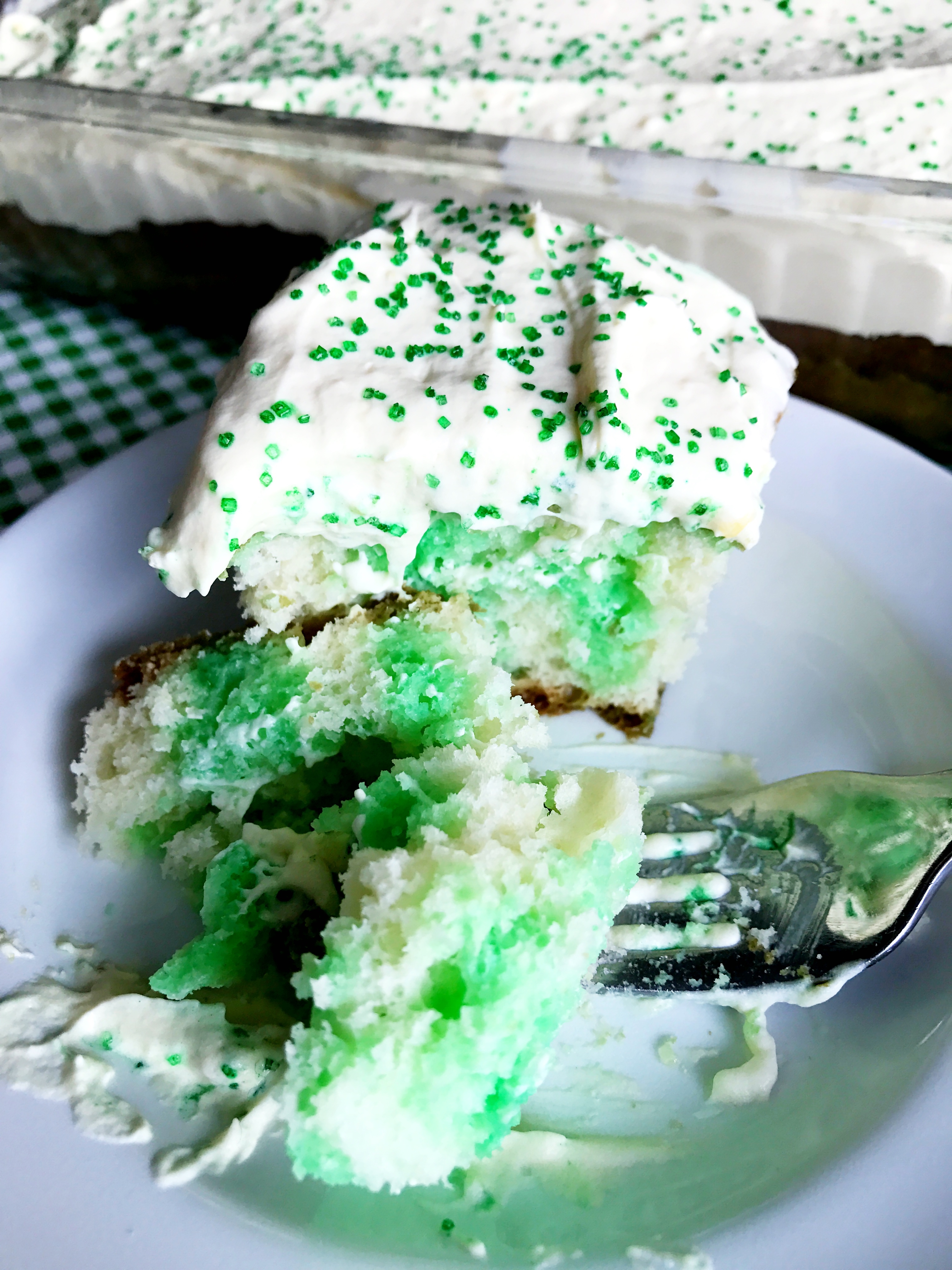 Back to the cake.   My mom made several versions of this Jell-O cake when I was young.   I would have to say my all time favorite is the strawberry version.  However, that wouldn’t be very St. Patrick’s like, being March and all.  So, the kiddos and I whipped up a green version of this “classic”…I’m calling it classic as opposed to vintage.  (Makes me not feel so old).