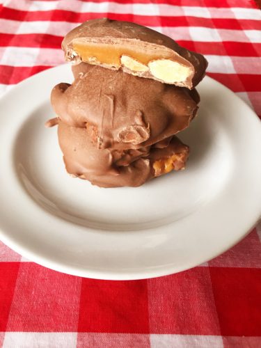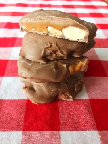 Either way, a candy that is top of my list are Sticky Paws! Have you ever had them? They are a layered treat of almonds, caramel and chocolate. Williams Sonoma is one of the original makers of them. However, how quickly we tend to eat these treats we have moved into a more cost effective method…making them ourselves! I think they taste even better than the store bought ones.
