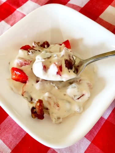 Cool and refreshing would be two adjectives for this Strawberry Cheesecake Salad. With only four ingredients, the light cheesecake flavored base with the added strawberries make this a perfect side dish or dessert for summer time. Simple to whip up and the ability to make this dish in advance also makes it great when hosting!