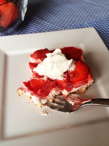 The strawberry top makes this dessert refreshing and the candied pretzel crust is just the right amount of sweet and salty. Oh yeah, did I mention the middle layer has cream cheese? Enjoy!