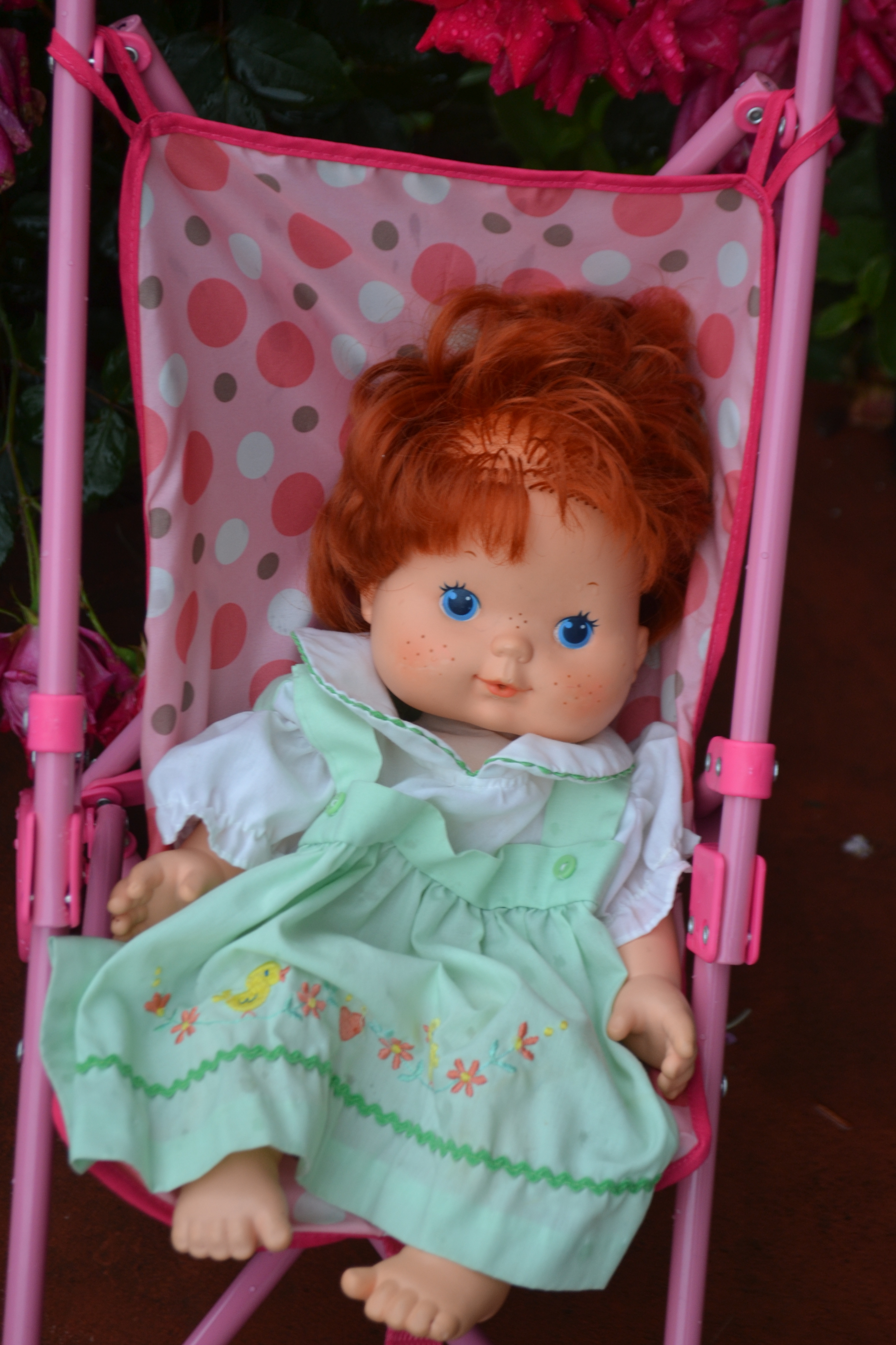 Did you notice the missing shoes and bonnets? A big Strawberry Shortcake dolly has on a newborn dress of Annie’s. 🙂