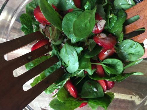 Strawberry spinach salad is quick and easy to make, and if one wants to cheat on the homemade dressing -it can easily be purchased from the grocery store ( a personal favorite of mine is the Raspberry Walnut Vinaigrette). I always enjoy feta cheese with just about anything, but if you enjoy goat cheese – it will add a little extra flavor and creaminess to this delicious salad – just don’t tell my husband 😉 I hope you enjoy the tastes of summer (during winter), too! It only 10 minutes to “whip up.”