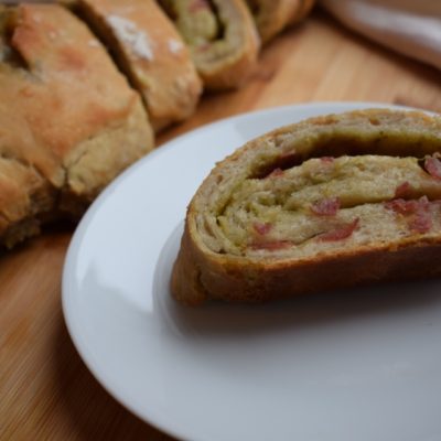 Well, I’m happy to report that the recreation was a success and really easy. I started with this dough recipe, but I’m sure you could use any yeasty bread recipe that you love. I rolled it out, spread about 1 1/2 tablespoons of pesto, and then sprinkled on Parmesan cheese and spicy Italian salami.