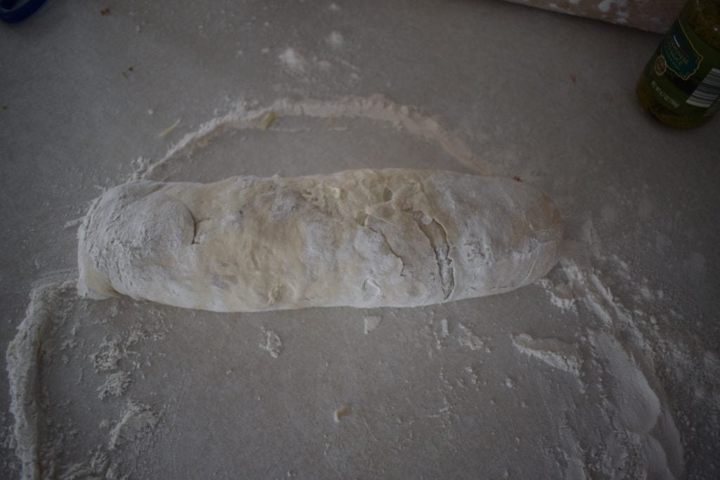 - Roll into a loaf and place on the prepared cookie sheet. Place three shallow slashes on the top of the loaf with a sharp knife.