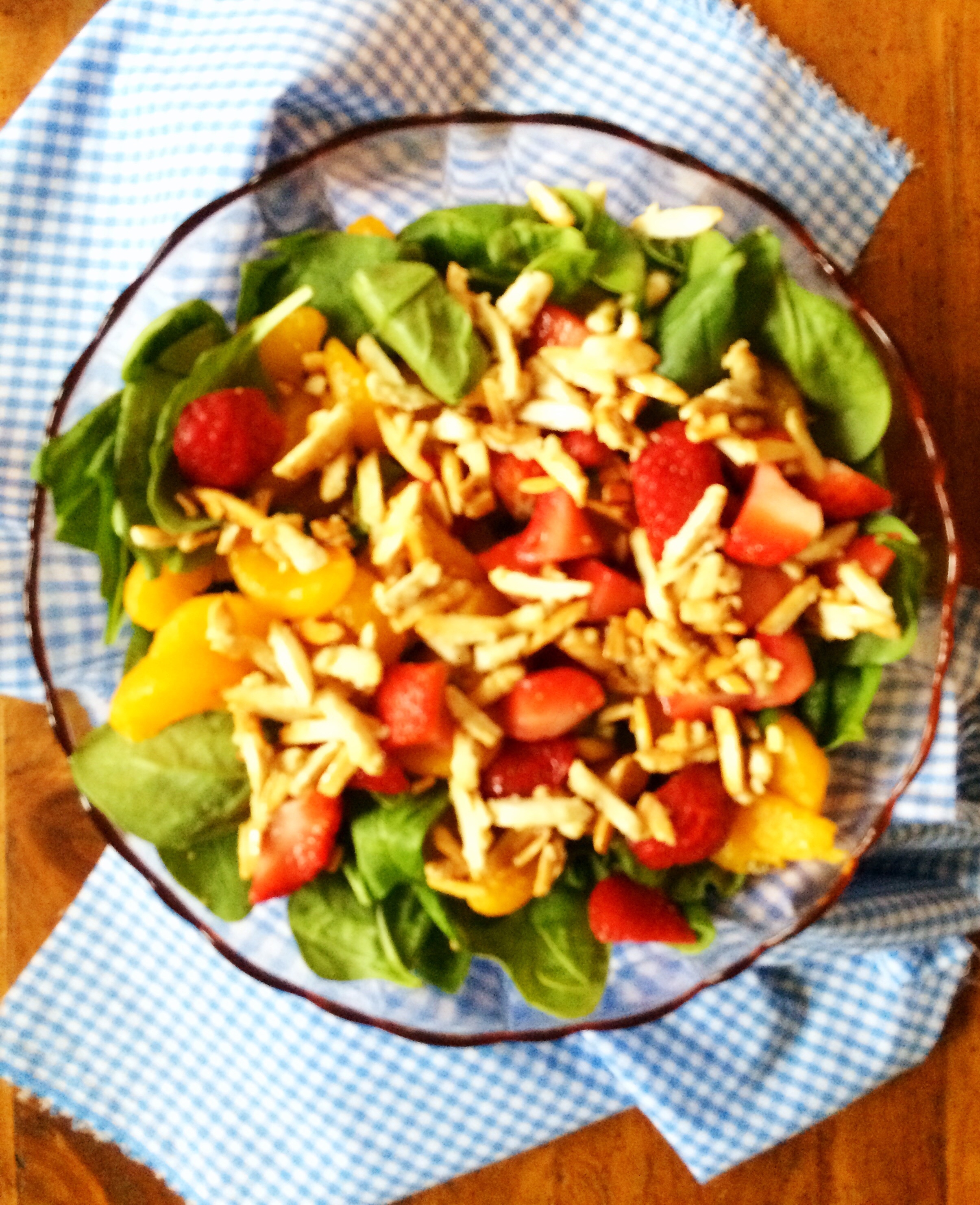 Last month my Mom hosted a lovely birthday lunch for me, it was such a fun day. A delicious menu with great company! One of the items on the birthday lunch menu was this Sugared Almond and Strawberry Salad. Since then it has easily become one of my favorites! The mix of sweet almonds, strawberries and mandarin oranges over a bed of spinach with a homemade dressing are the perfect combination. Check out the recipe below!