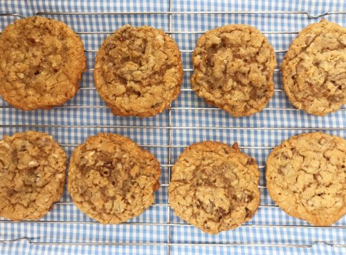 These cookies are crispy in the outside and chewy in the inside, packed with flavor. Coconut, pecans, oats and chocolate chips with the added flavor depth of cinnamon make these a flavorful dessert.
