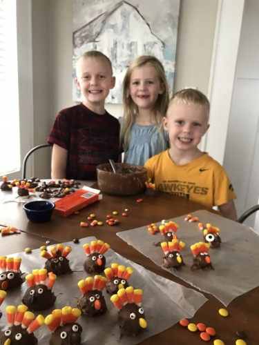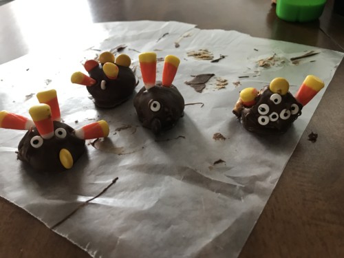 And just to prove that life doesn’t go as planned…right after I snapped this picture, that cute little guy on the right threw up and this batch of peanut butter ball turkeys had to hit the trash. But to no avail, we cleaned it all up, sanitized and the older two enjoyed it so much we created more to enjoy at Thanksgiving.