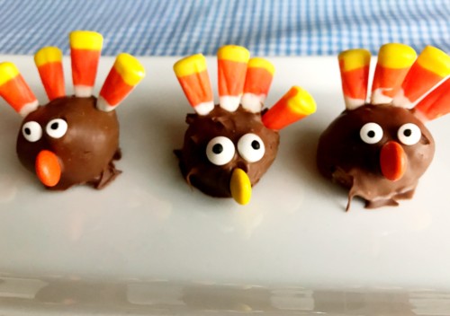 You basically take your standard peanut butter ball recipe and decorate as a turkey prior to the chocolate setting. The peanut butter ball recipe below works well because it is a little thicker of a peanut butter mixture and helps support the candy better. Be sure to allow your peanut butter balls to cool before dipping and decorating or you may have some sagging feathers 😉
