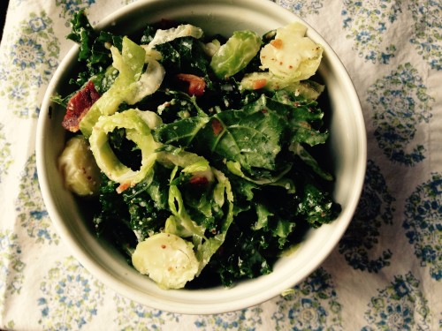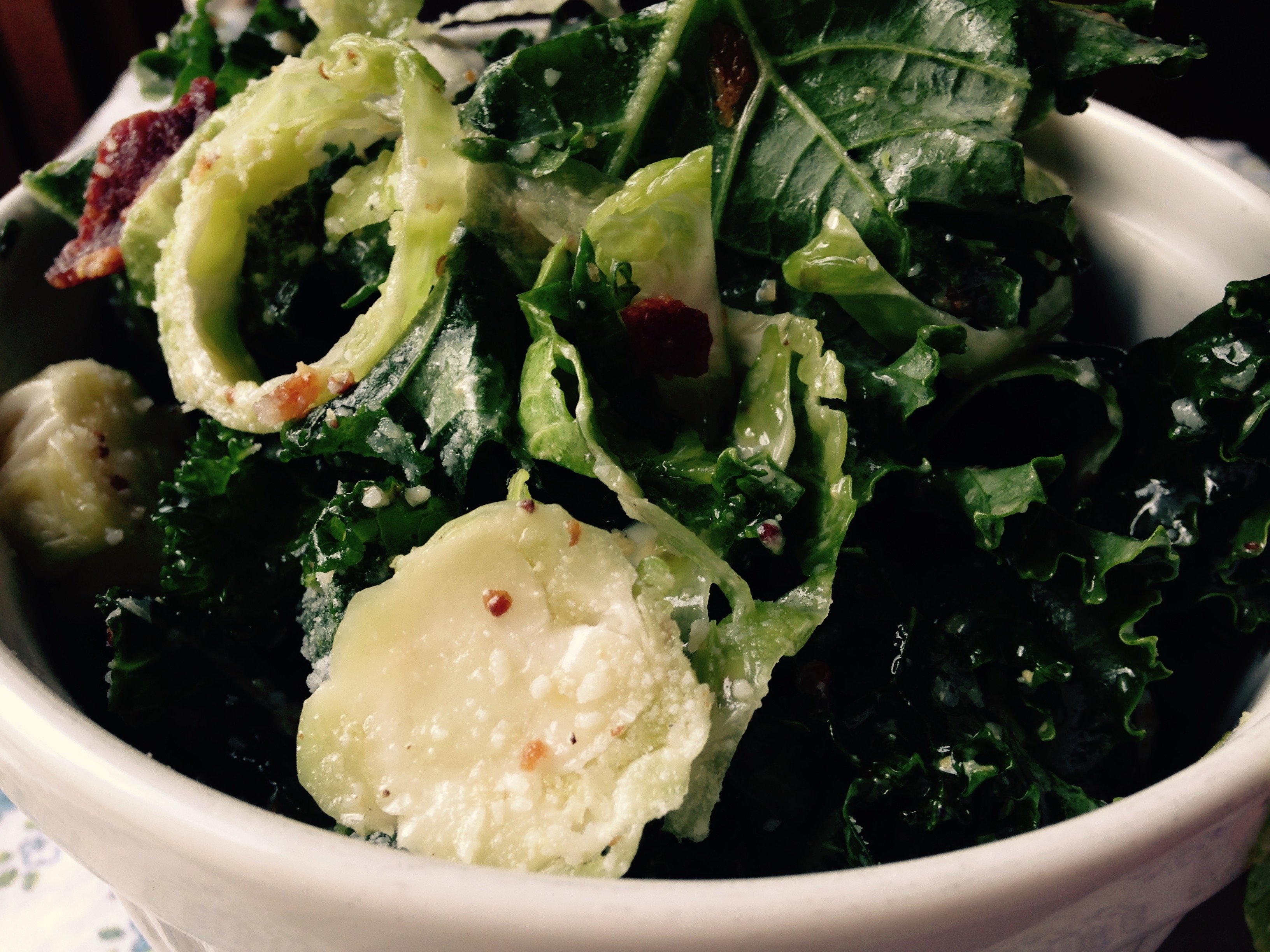 - Mix sliced kale, shave brussel sprouts in a large bowl. Throw in bacon and cheese. Pour dressing over top and toss salad until all ingredients are distributed throughout.