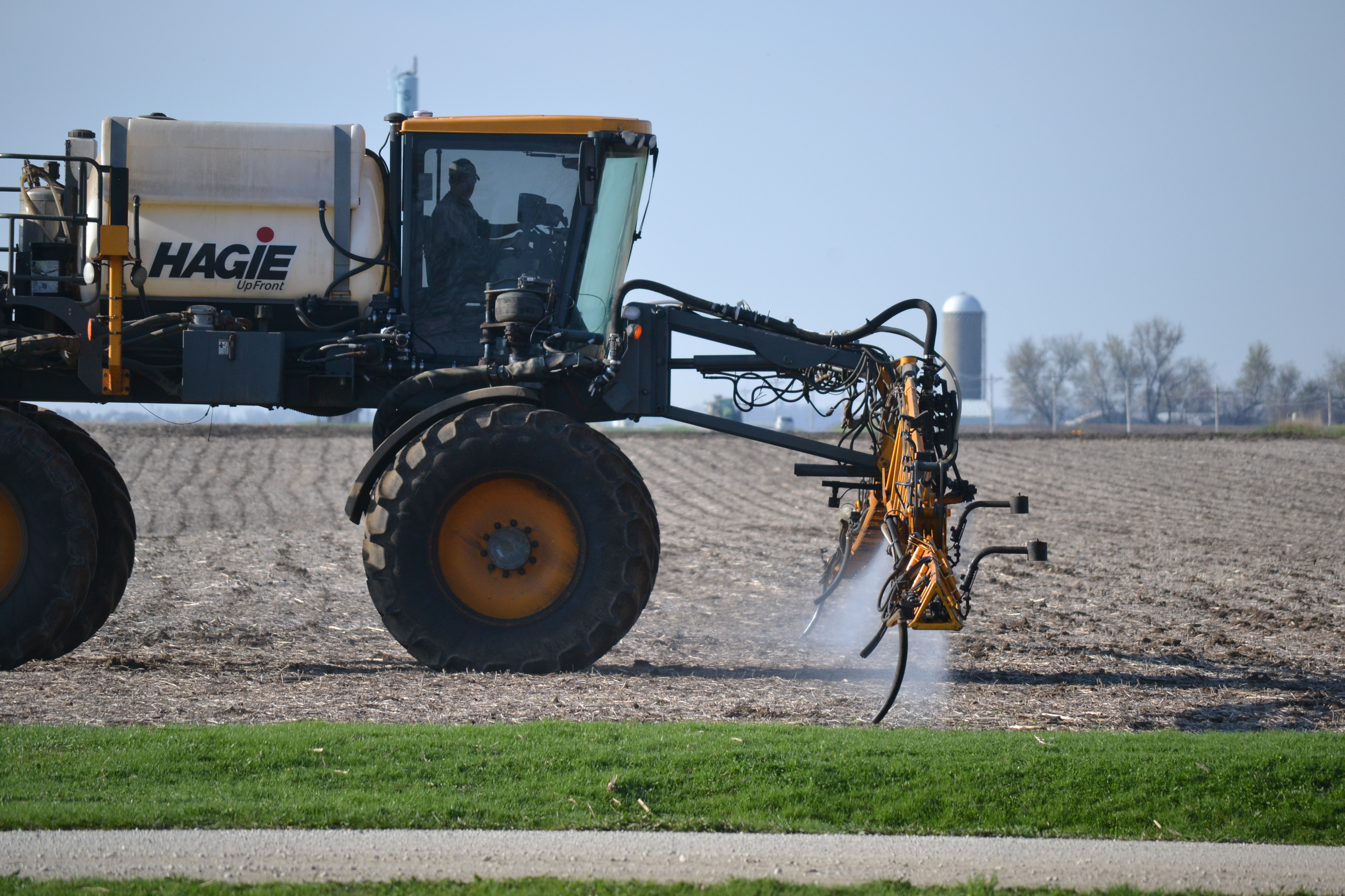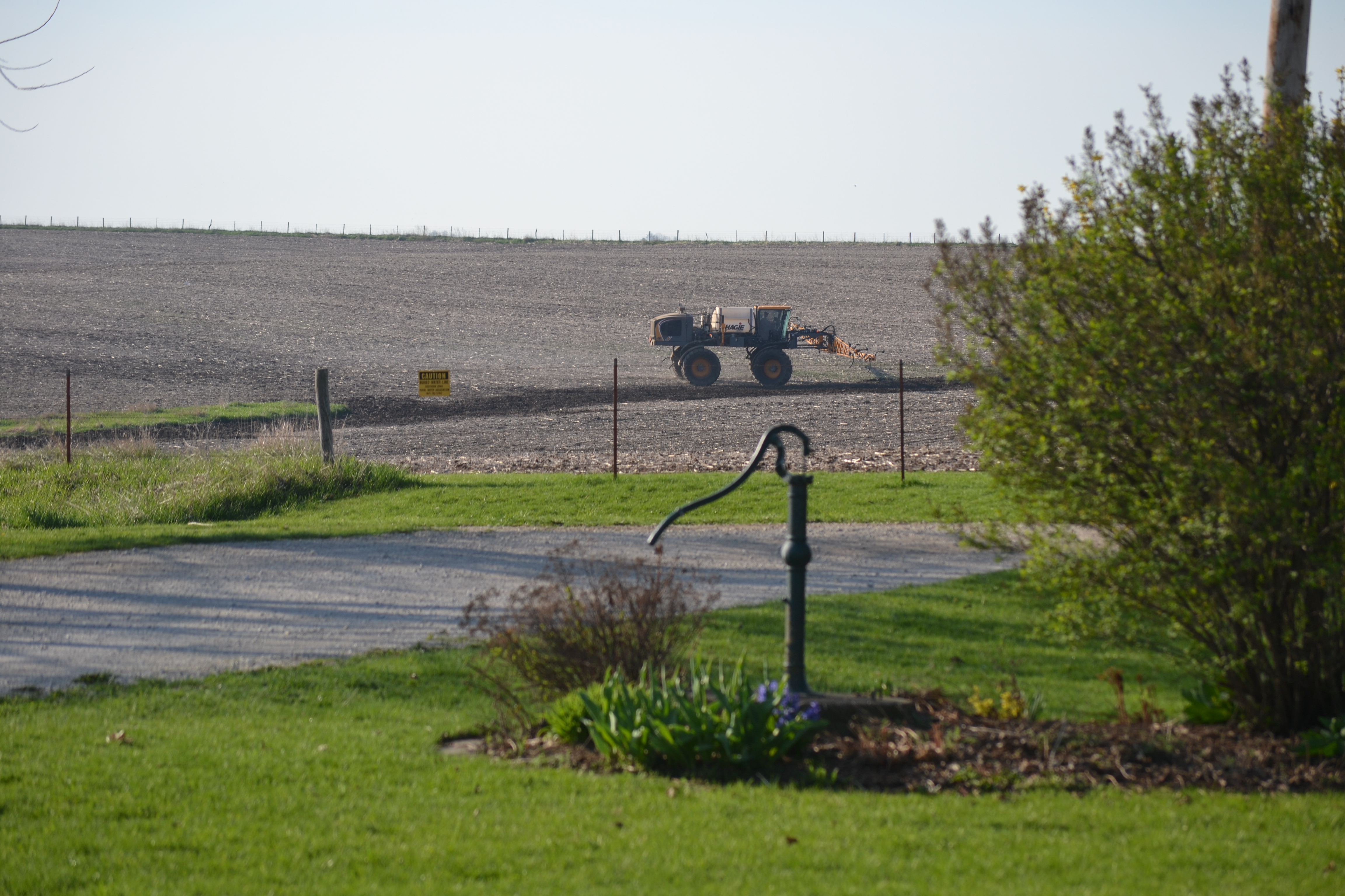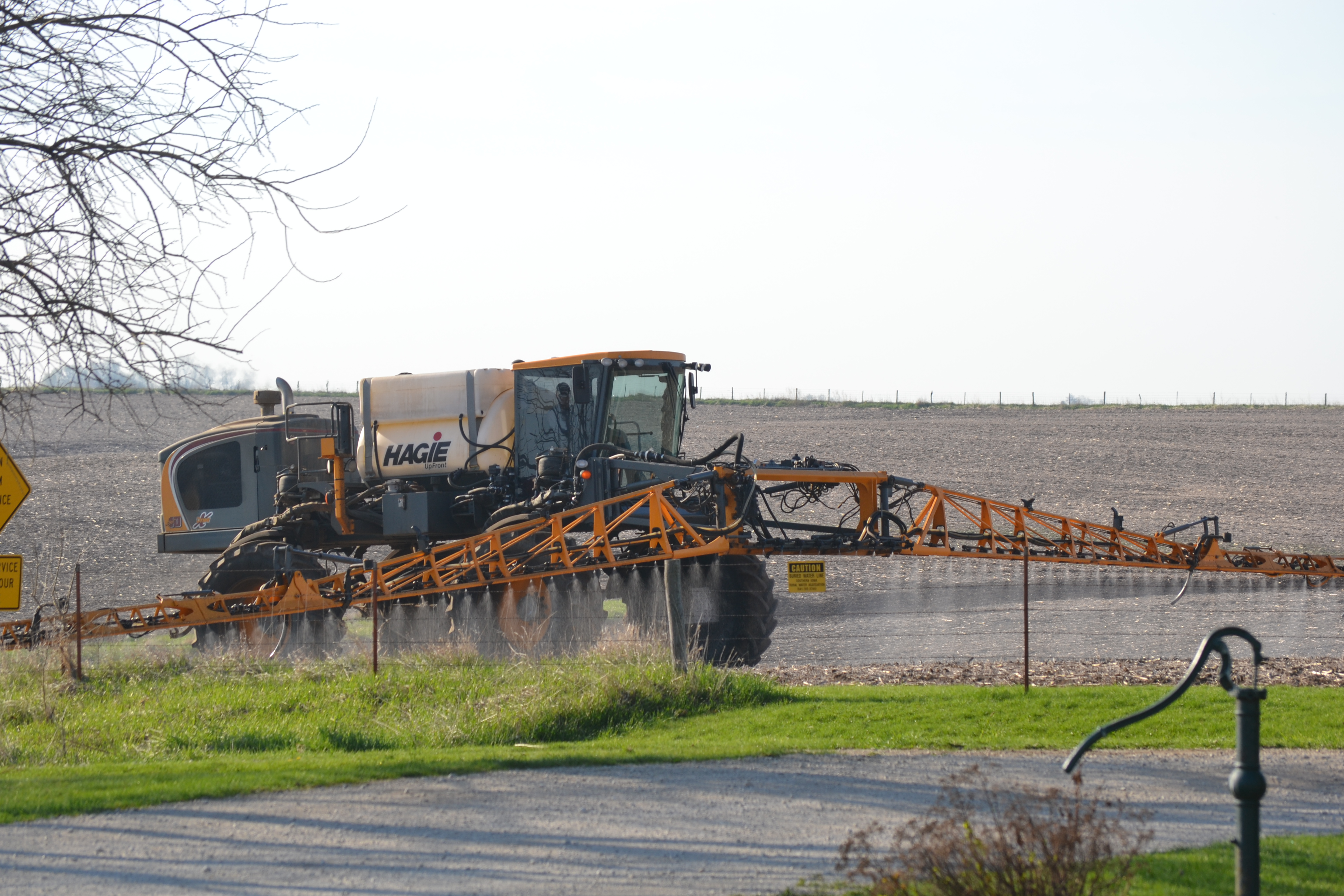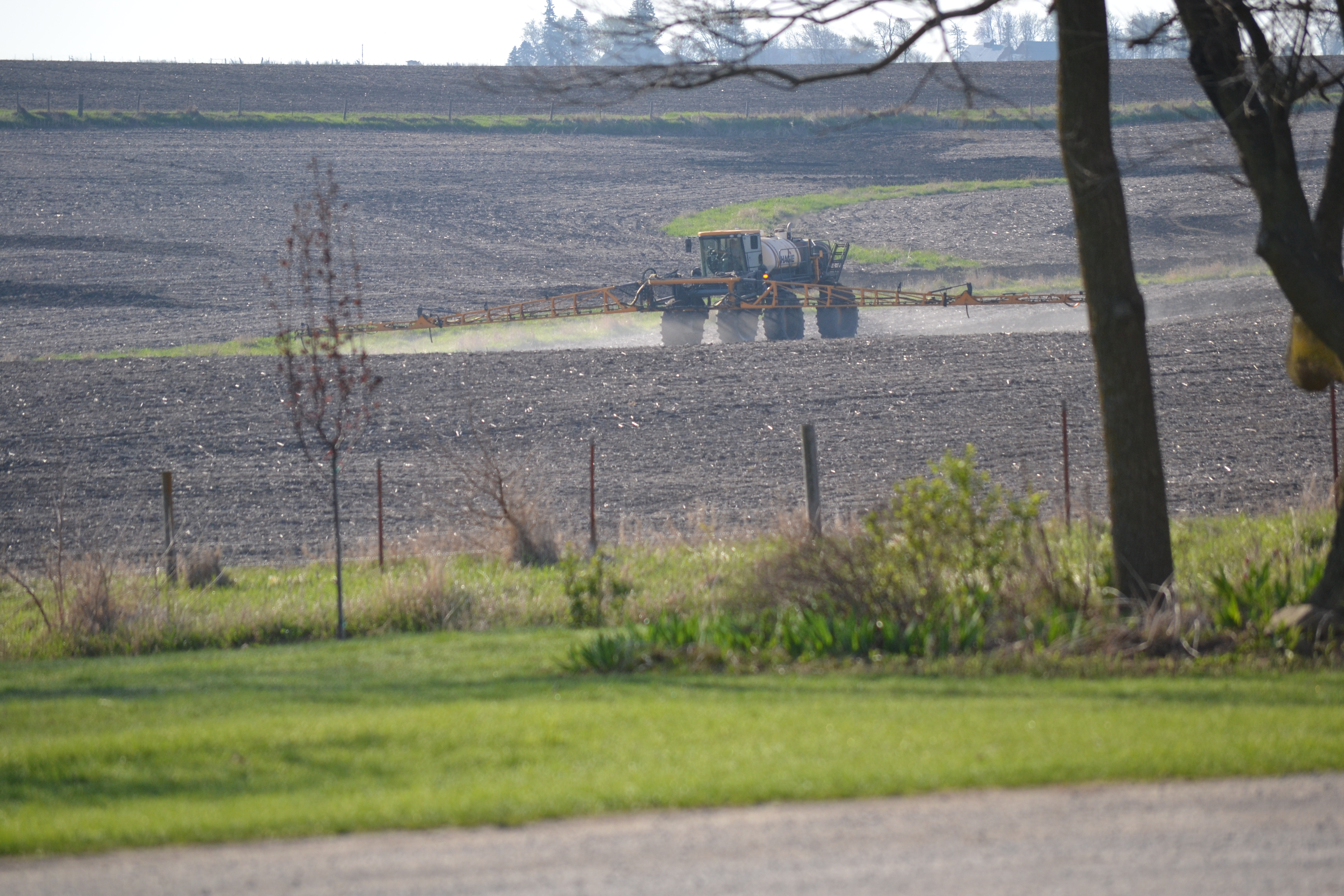 This machine is responsible for going over every inch of ground before each kernel of corn is planted. The pre-emergence spray being applied is mostly herbicide (which kills the weeds) and a little fertilizer (which makes the plants big and healthy). This field will be soon be planted to corn.