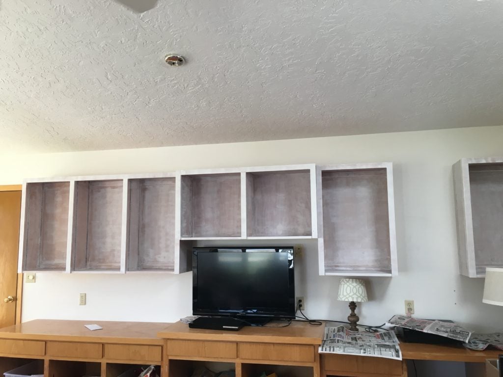 The entertainment center in the living room space we reconfigured. Instead of base cabinets with a counter-top and wall cabinets, we made into more like “built-ins” and rotated the upper cabinets so they were larger horizontally. I think they fit more proportionately to the wall space. We had our carpenter add a crown molding piece to “finish it” at the top. Then we painted it with a soft white. I just need to add the hardware to the base cabinets and this will be complete.