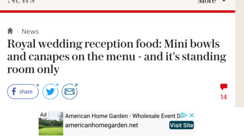 The food. Just heard this morning the reception guests will be receiving food in bowls as there will be walking and mingling, not sitting at a table for hours. Interesting!