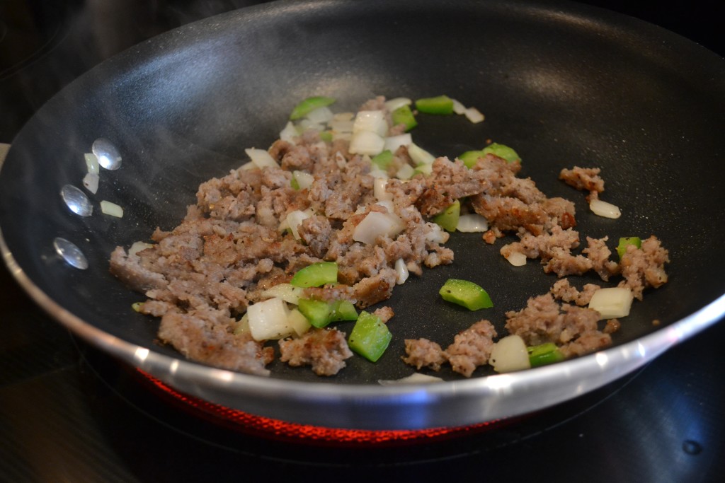 - Brown sausage, onion and peppers in skillet.
