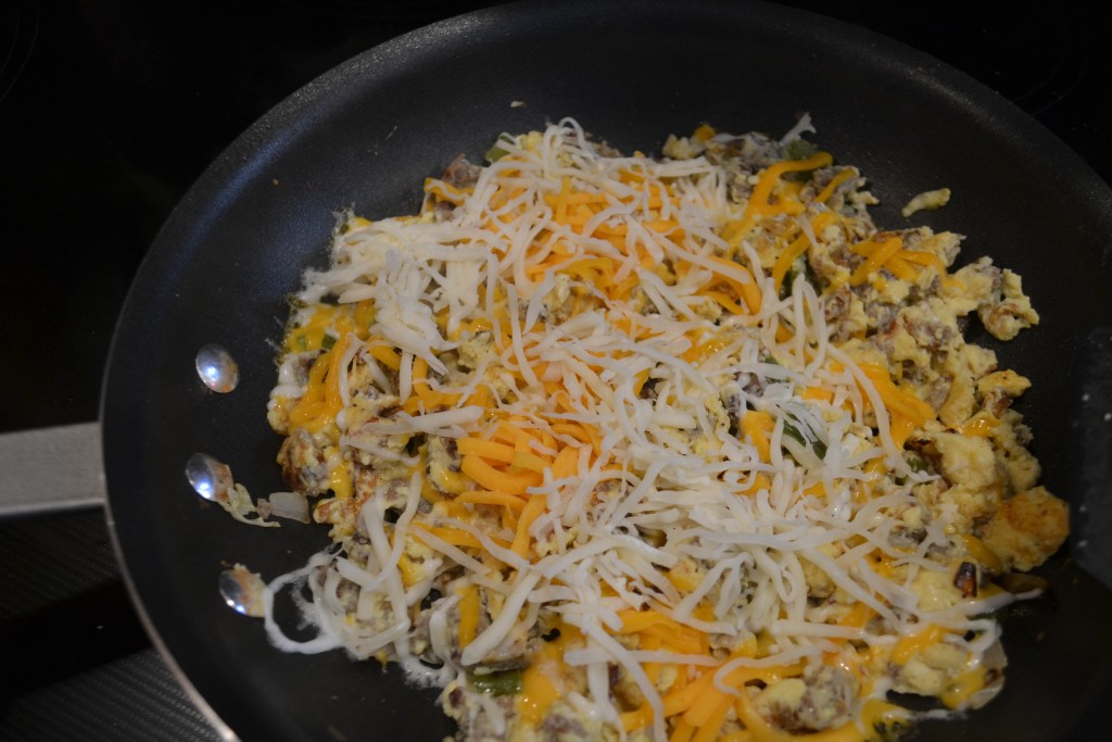 - In bowl, whisk together eggs until light and frothy. Add milk. Pour over sausage mixture and stir until done. Add a few drops of hot sauce, if desired. Add cheese and cilantro and cook til cheese is melted.