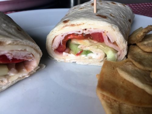 The wraps are so easy to make, and just by adding a couple fresh vegetables, it can really enhance this somewhat basic sandwich. I use a fajita size tortilla – or bigger. Then I spread on a thin layer of mayonnaise (Ranch dressing would also be delish), then 1 slice of Havarti cheese, 3 slices of smoked turkey, 4 slices of cucumber, and 2 slices of Roma tomato. That’s it! Then just wrap it up slowly and tightly – keep the shape by covering in plastic wrap or foil. Refrigerate until ready to eat.