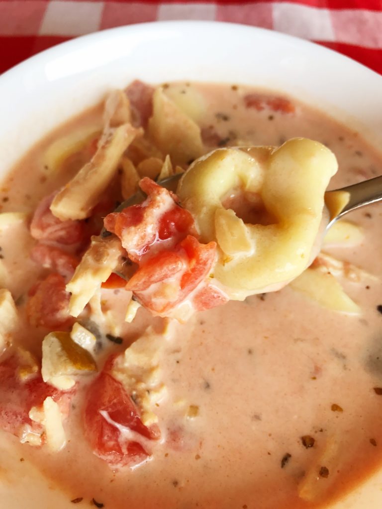 - Add in diced chicken and tortellini continue to simmer additional 10-15 minutes until tortellini is cooked. Enjoy!