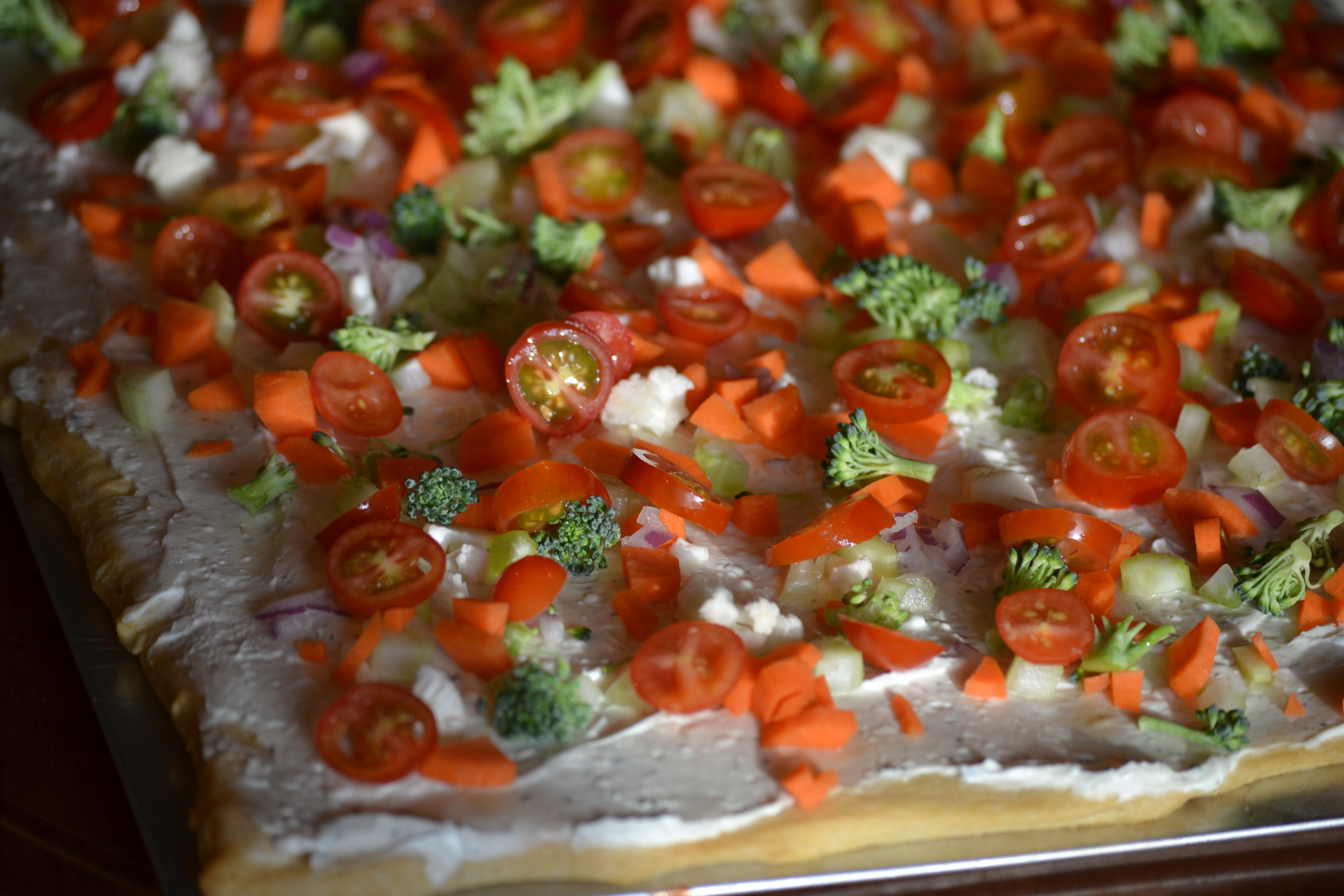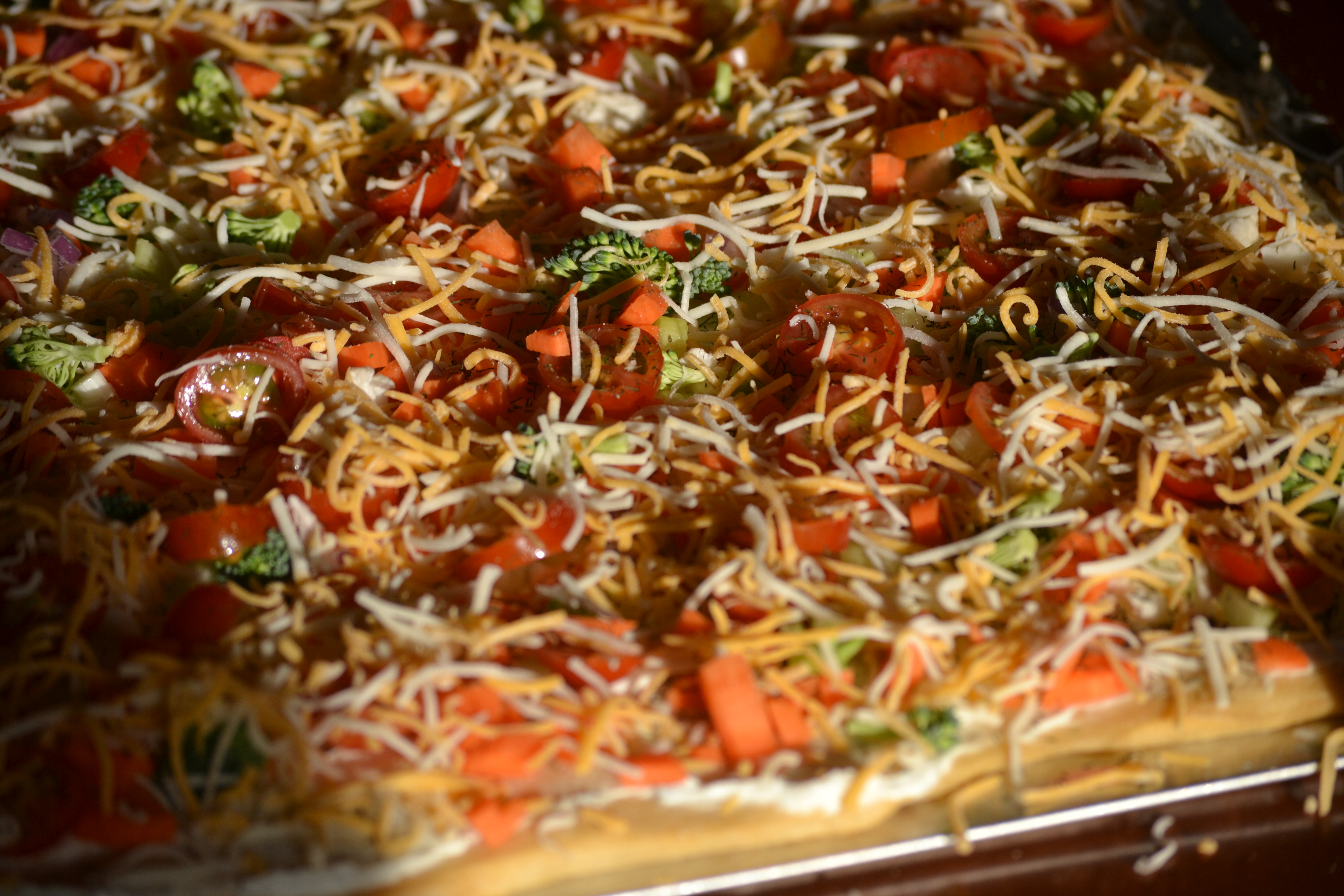 Got a text from Annie that there was going to be a little birthday get-together for Shane after church yesterday. “Can you bring an appetizer?” she asked. And of course I agreed and began thinking about a dish everyone would like……………yep………..Veggie Pizza. It is quick, easy, healthy (for the most part) and pretty. I like pretty, don’t you? This recipe is so versatile. I don’t think I’ve ever made it the same twice. This is what I did yesterday: